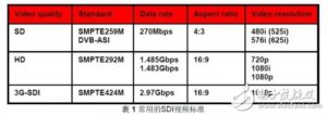 SDI,串行數(shù)字接口,是用來傳輸標(biāo)清、高清、3G 高清等無壓縮數(shù)字視頻信號的一個標(biāo)準(zhǔn),當(dāng)前最流行的SDI視頻格式如表1所示。由于SDI具有高清特性,時延小,還可以重復(fù)利用已布網(wǎng)的模擬視頻電纜等優(yōu)勢,正逐漸地被安防、監(jiān)控等領(lǐng)域廣泛采用。目前市面上SDI相關(guān)設(shè)備主要是SDI延長器、分配器、矩陣、多畫面分割、編解碼器、SDI光端機(jī)、DVR等。