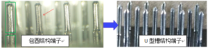 改善建議;①.(沖壓類)PIN腳結構即然無法避免,則可以依靠縮短使用周期來改善。比如,鍍錫/可焊鎳的產品,正常保質期為12個月。那么,客戶下訂單時,可以與客戶確認一下大概的使用日期。盡量讓產品在生產后的3個月內使用,產品經過焊錫后。切PIN點已被封閉,異常自然也就不會發生了。②.PIN針中間氧化,原因在結構,改善自然也就在結構。如下圖中,將包圓結構改成“U”型槽結構,產品鍍層均勻且不會有風/烘干問題存在,自然就解決了。