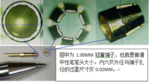 圖中為1.00MM冠簧端子,也就是普通中性筆筆頭大小。內六爪外徑與端子孔徑的過盈尺寸僅0.02MM。
