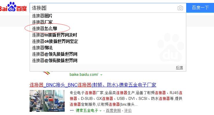 在百度下拉框,筆者發現不少用戶在搜索“連接器怎么綁”這個問題,于是筆者也搜索了一下這個問題,出來的都是魚鉤連接器的信息,讓筆者很是不解。在這里,筆者實在難以揣測用戶背后的真實意圖。