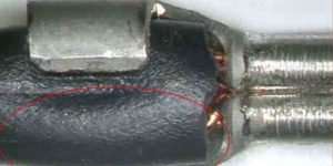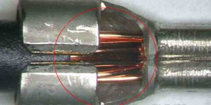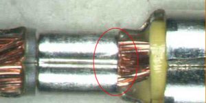 不良的原因:壓接手勢不正確或擋板調試不當導致芯線壓接部位壓進外皮,造成外皮壓接過度不良。