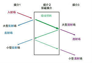 反射和吸收是兩個主要屏蔽機制。下圖是公認的屏蔽層分析代表,其中媒介2為屏蔽層。部分入射射頻能量從媒介2表層反射出去。能量的剩余部分進入媒介2,由于材料的電阻損耗,能量被耗散,部分能量被吸收。能量的剩余部分媒介2到達媒介3,其中部分能量又被反射,其余的部分能量抵達媒介3,即屏蔽層需要隔離的區域。