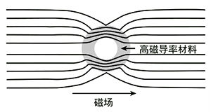 大部分屏蔽體只防電場輻射。防磁需要另辟蹊徑。因為沒有實用方法屏蔽磁場,必須使用高導磁率材料覆蓋電路,可以改變電磁輻射方向,避免其干擾電路。高導磁率材料(在圖中以圓環表示)能夠使磁場變形、圓環中心絕緣。在預計出現高能量、電磁脈沖時,經常采用這類屏蔽。比如射頻電纜組件在做相應電磁兼容實驗室,會在線纜外面套一些磁環,減小磁干擾。