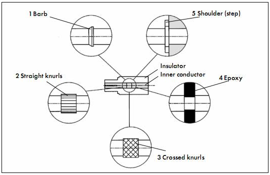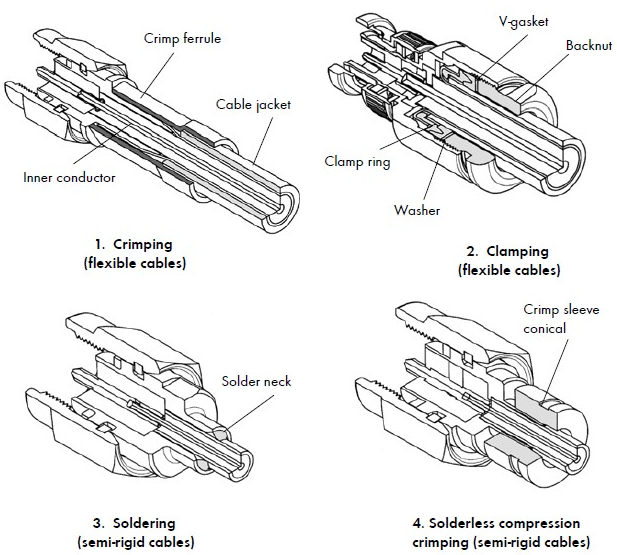 同軸線纜主要分成柔性線纜和半剛線纜兩大類. 柔性線纜外導體適合用卷曲(crimp)和壓緊(clamp)方式與同軸連接器連接—小的柔性線纜也常常用焊接方式與同軸連接器外導體連接. 柔性線纜內導體適合用卷曲(crimp)和焊接方式與同軸連接器內導體連接. 而半剛線纜外導體幾乎是用焊接方式與同軸連接器外導體連接,也有部分采用壓緊的方式—其中不少具有結構專利, 內導體主要焊接到同軸連接器內導體, 但是有些較大的波紋管的內導體是空心的,可車制成內螺紋,通過螺紋方式與連接器內導體連接.還有一種情況是: 將同軸線纜(如RG141)的內導體用作同軸連接器的內導體—只需將線纜與連接器的外導體連接.