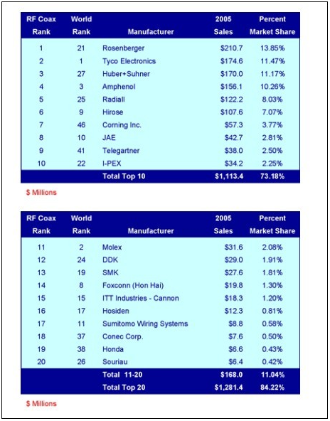 全球射頻同軸連接器10強廠商—2012年排名: