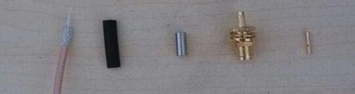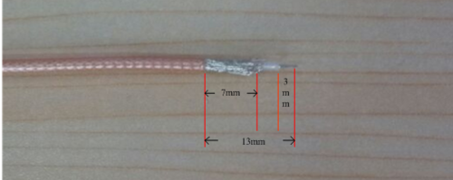 準(zhǔn)備線材。從左至右線材:國產(chǎn)同軸電纜RG316,熱縮管,壓線套,SMA外螺內(nèi)孔母頭,小針。