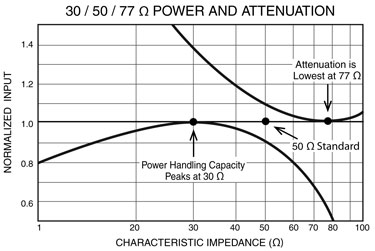 高頻連接器阻抗通常為50或75Ω。最大功率傳輸阻抗值為30Ω,理論最小衰減阻抗為77.5Ω。高頻連接器代表這兩個(gè)值之間的妥協(xié),因?yàn)樗鼈兊钠骄导s為50Ω。(圖2)當(dāng)需要長(zhǎng)時(shí)間的傳輸運(yùn)行時(shí),如CATV系統(tǒng)中的最小衰減,對(duì)優(yōu)化功率傳輸?shù)年P(guān)注較少,因此較高阻抗的75Ω連接器通常用于這些系統(tǒng)。