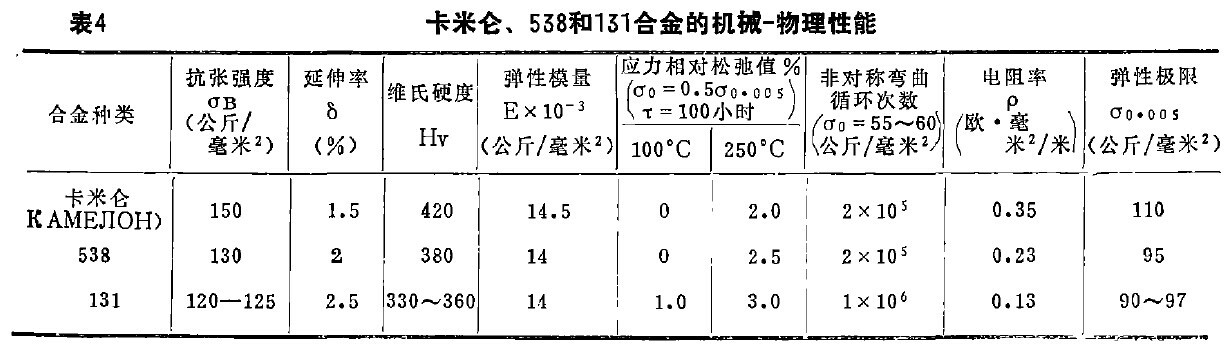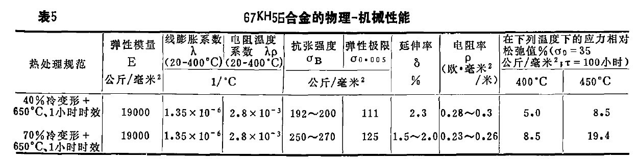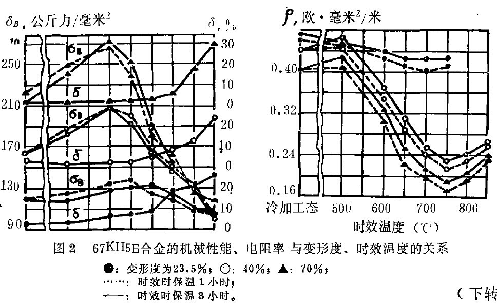 有關文獻介紹了一種牌號為s7KH5s的導電彈性合金。該合金在400℃-500℃的高溫下仍具有很高的松弛穩定性,并兼有相當低的電阻率(0.27~0.3歐·毫米“/米)。它可用來制造導電彈簧,特別是各類繼電器的片狀導電彈簧。圖2所示為該合金的抗張強度、電阻率與變形度、時效溫度的關系。表5列出了變形度為40和70%,并經最佳溫度時效后的物理一機械性能。