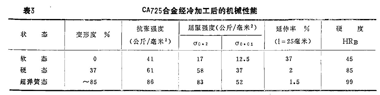 3.CA725合金。這種合金是為滿足電子儀器、器件對釬焊性和耐蝕性等提出的越來越高的要求而研制的。目前,在美國已作為接插件用彈簧材料實現了標準化。典型成分為:Ni9%, Sn2%, Cu余量。表3所示為該合金經冷加工后的機械性能。
