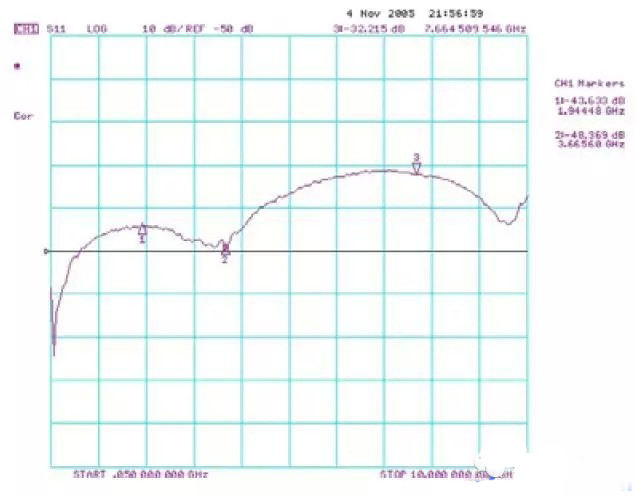 由于網絡分析儀測量上的限制,我們必須將兩個SMA接頭連接起來(如圖一),并且使用時域反射儀測量對接后的SMA接頭阻抗是否為50歐,之后再接上網絡分析儀進行測量,測量的范圍為50MHz到10GHz,測量結果(如圖二)。