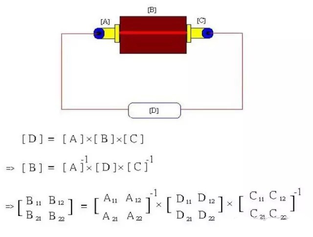 在使用HFSS提取完SMA接頭3D Model的S-Parameter之后,接下來所要做的就是使用ADS (Advanced Design System )進行SMA接頭參數的驗證。我們可以將S-Parameter轉成矩陣的表示方法(如圖七),假設SMA接頭參數各為[A]及[C],電路板參數為[B],量測結果為[D]即可得到圖七中的式子。