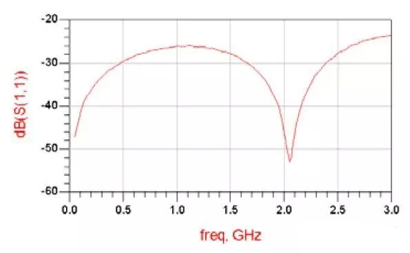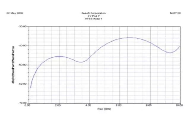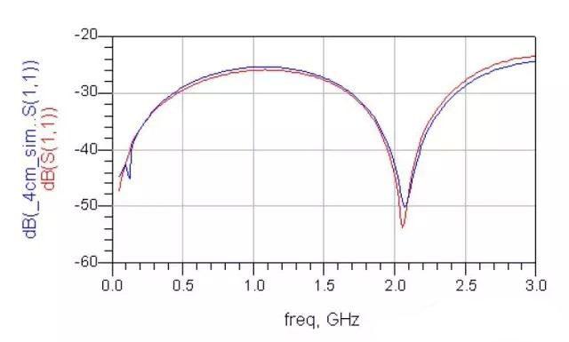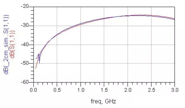 模擬的頻率范圍為100MHz到10GHz,而在Teflon材質Relative Permeability參數等于3.317,Loss tangent參數等于0.0035時,我們得到了與測量結果吻合的S11參數(如圖五)。
