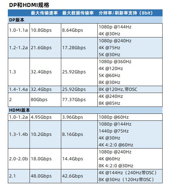 DP、HDMI每一代的協議版本中最主要的參數是傳輸速率和數據傳輸率。