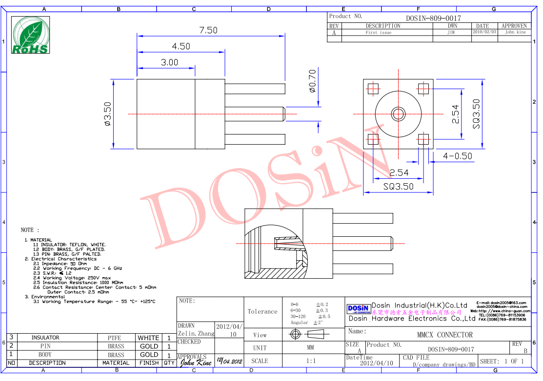 板端MCX母直式兩孔法蘭銅鍍金50Ω