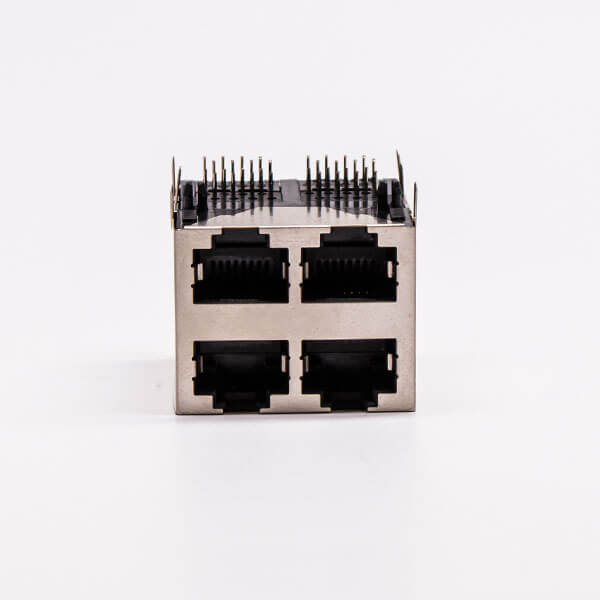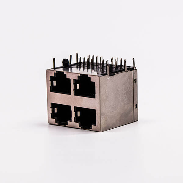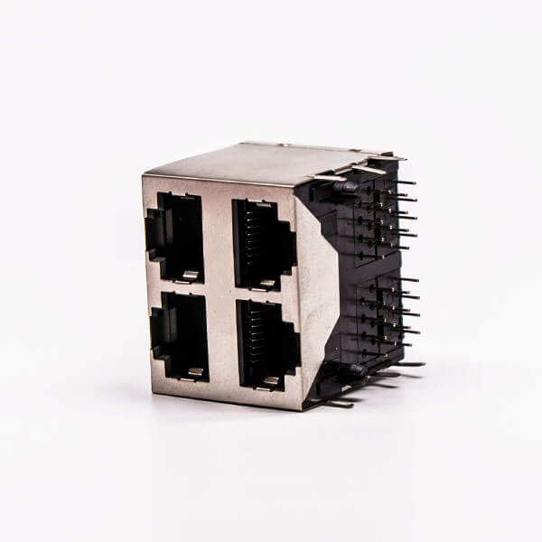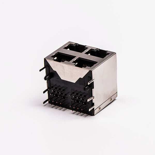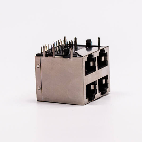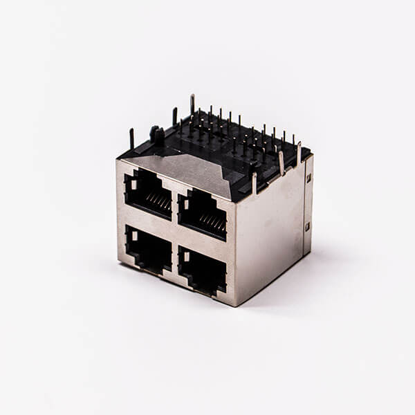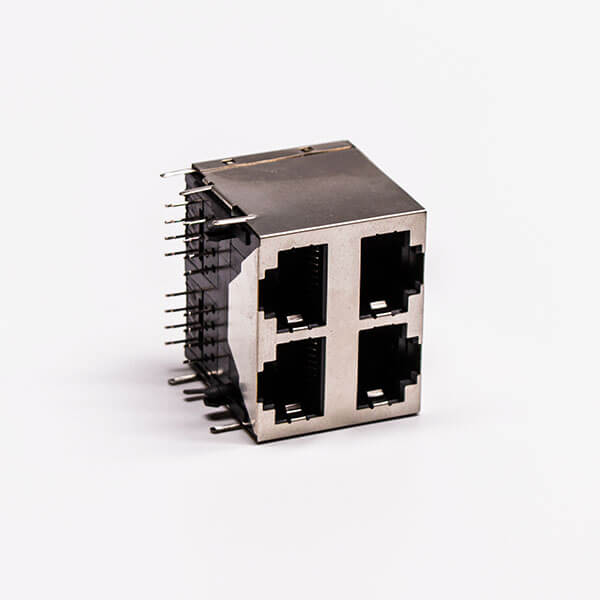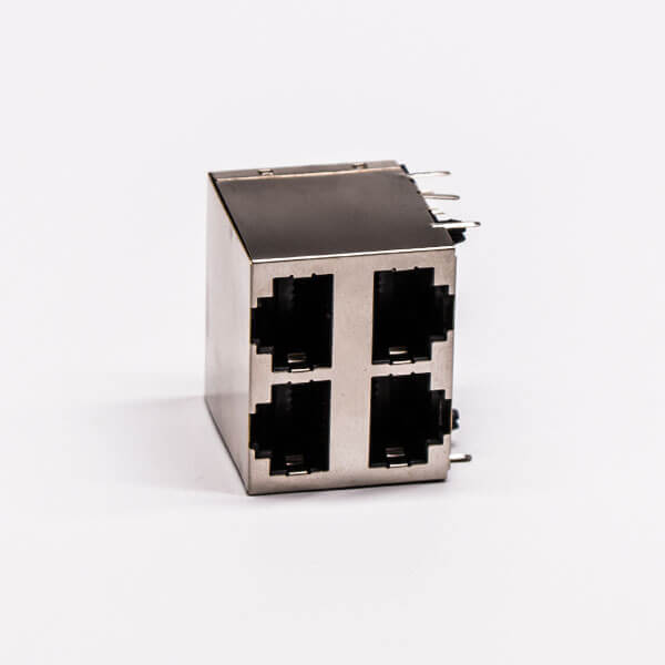 標簽:RJ45,母座,PCB板,8P,2*2,四口,彎式,帶屏蔽,不帶燈,帶彈片,銅殼,不帶彈片