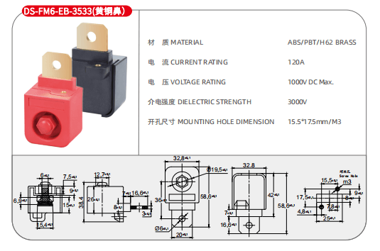 英文描述:Feed Through Junction Blocks, 120A,Outer Screw(M6), Red
