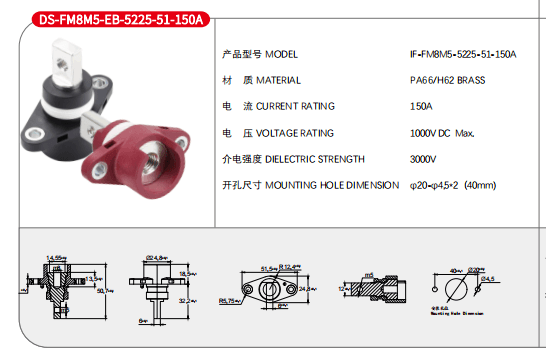 英文描述:Single Stud Type Junction Blocks, 150A, Internal Screw (M8), Busbar with M5,Flange Mounting, Red