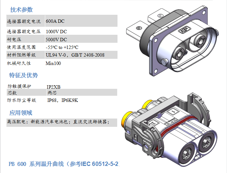 PB600系列連接器(Phoebus 400/600 Series Connector)的名字源于古希臘神話中的太陽神福波斯(Phoebus),就是我們熟知的阿波羅。在希臘神話中,他主管光明與音樂。而PB600系列的命名也是出于同樣的原因——希望這個系列能夠成為連接光明的橋梁,將美好的事物帶給人們。PB600系列連接器是一種超高電流的連接器,通常用于高壓配電、新能源汽車電池包等方面。PB600系列具有超大電流的優良特性,能承受高電壓和高電流,能做到5-10分鐘充電80%,實現了充電像加油一樣快。PB400/600系列連接器是一種超高電流的連接器,通常用于高壓配電、新能源汽車電池包等方面。