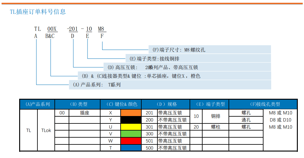 如果您覺(jué)得TL500系列,無(wú)法滿(mǎn)足您的需求,可以咨詢(xún)我們的工防師,讓他們根據(jù)您的需求推薦適合您的產(chǎn)品。TL系列產(chǎn)品,可選電流分別是100A,200A,300A,400A,500A,600A,有直彎兩種方向,可選擇帶不帶互鎖功能。